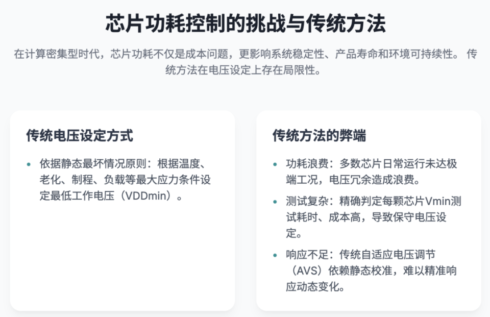 傳統(tǒng)的自適應電壓調(diào)節(jié)(AVS)機制雖能實現(xiàn)一定程度的動態(tài)電壓調(diào)整,但通常依賴靜態(tài)校準曲線和固定裕度,難以對運行中實際負載、路徑延遲變化做出精準響應。
