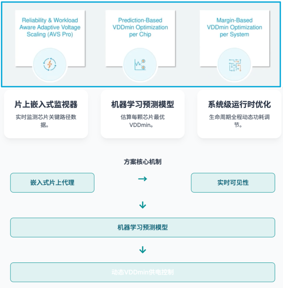 其核心機制在于:通過嵌入式片上代理(embedded agents)對芯片關鍵路徑進行實時監(jiān)測,結(jié)合機器學習模型預測每顆芯片、每一運行環(huán)境下的最優(yōu)VDDmin,從而實現(xiàn)更為精細的動態(tài)供電控制。