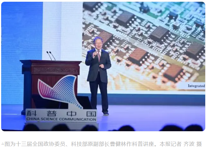 “芯片問題是事關(guān)百年發(fā)展的長期戰(zhàn)略問題,不是短期應(yīng)急問題,必須持之以恒去發(fā)展。”“要充分發(fā)揮制度優(yōu)勢,集中優(yōu)勢隊(duì)伍持續(xù)攻關(guān)。”“要敢于開辟新賽道,打造新生態(tài),推進(jìn)‘再全球化’。”……9月25日下午,寬敞明亮的全國政協(xié)禮堂里,十三屆全國政協(xié)委員、教科衛(wèi)體委員會副主任曹健林正站在舞臺中央巨大的顯示屏前,以“同心協(xié)力,補(bǔ)短揚(yáng)長,開拓中國特色的集成電路產(chǎn)業(yè)發(fā)展道路”為題,為坐在臺下的全國政協(xié)委員、地方政協(xié)委員、高校學(xué)生、科研工作者等700余名觀眾作科普講座。