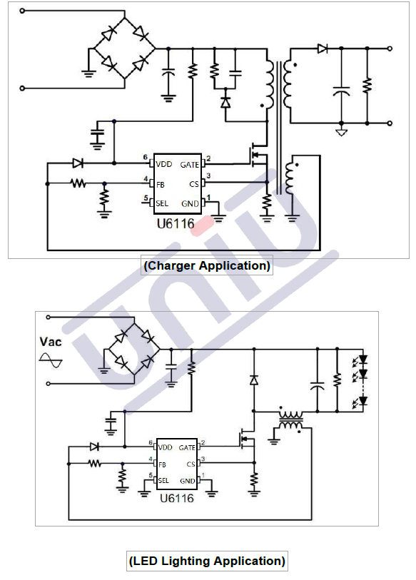 •產(chǎn)品描述:U6116是一款高性能初級(jí)側(cè)調(diào)節(jié)(PSR)控制器,具有高精度CV/CC控制,是充電器應(yīng)用的理想選擇。如果SEL引腳短于GND,該IC還可以支持LED照明的準(zhǔn)諧振(QR)降壓恒流拓?fù)?。在CV模式下,U6116采用AM(幅度調(diào)制)模式和動(dòng)態(tài)響應(yīng)的混合多模式控制。內(nèi)置的電纜跌落補(bǔ)償(CDC)功能可以提供出色的CV性能。U6116集成了調(diào)頻模式的功能和保護(hù),提高了系統(tǒng)的效率和可靠性。CC模式。集成電路采用帶線路和負(fù)載CC補(bǔ)償?shù)腜FM控制。該IC可以實(shí)現(xiàn)無(wú)音頻噪聲運(yùn)行和優(yōu)化的電壓鎖定(UVLO)、VDD過(guò)壓保護(hù)(VDD OVP)、逐周限流(OCP)、短負(fù)載保護(hù)(SLP)、門箝位和VDD箝位。