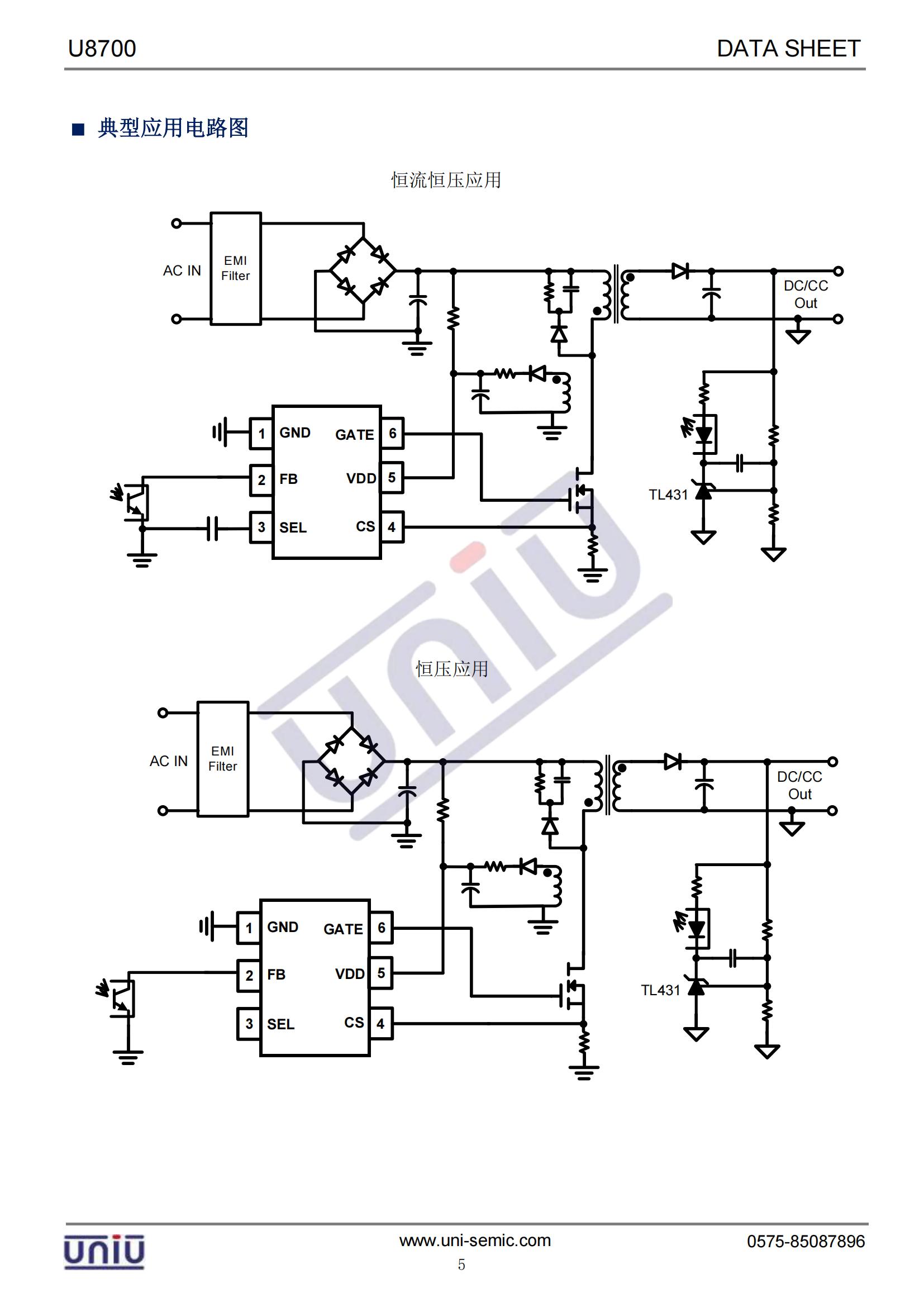 U8700是一款針對(duì)離線式反激電源設(shè)計(jì)的高性能功率開關(guān)。U8700內(nèi)部具有高精度65kHz開關(guān)頻率振蕩器,且?guī)в卸额l功能可優(yōu)化EMI性能。芯片采用綠色節(jié)能模式和打嗝模式工作,可以保證小于75mW的待機(jī)功耗。U8700集成有完備的保護(hù)功能,包括:VDD欠壓保護(hù)(UVLO)、VDD過壓保護(hù)(OVP)、逐周期電流限制、短路保護(hù)(SCP)、過載保護(hù)(OLP)、過熱保護(hù)、軟啟動(dòng)、VDD箝位和CS管腳開路保護(hù)等。