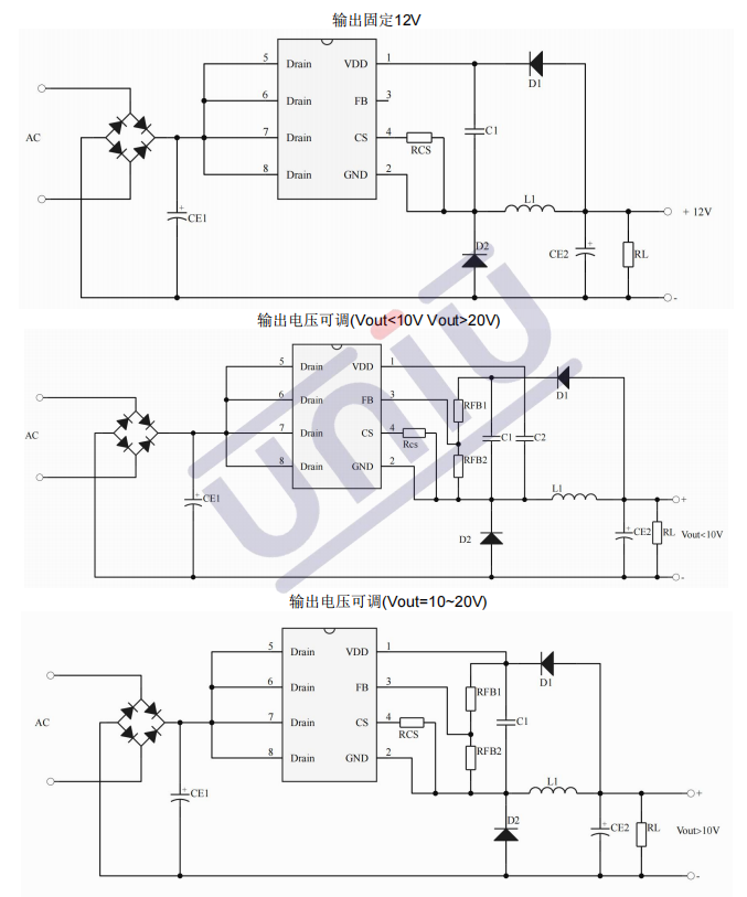 •主要特點(diǎn):集成 500V 高壓?jiǎn)?dòng)電路;多模式控制、無(wú)異音工作;支持降壓和升降壓拓?fù)?默認(rèn) 12V 輸出( FB 腳懸空);待機(jī)功耗低于 50mW;良好的線(xiàn)性調(diào)整率和負(fù)載調(diào)整率;集成軟啟動(dòng)電路;內(nèi)部保護(hù)功能 :過(guò)載保護(hù) (OLP);逐周期電流限制 (OCP);輸出過(guò)壓保護(hù) (OVP);VDD 過(guò)壓、欠壓和電壓箝位保護(hù)