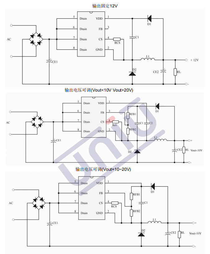 •主要特點:集成 650V 高壓啟動電路;多模式控制、無異音工作;支持降壓和升降壓拓撲;默認 12V 輸出( FB 腳懸空);待機功耗低于 50mW;良好的線性調(diào)整率和負載調(diào)整率;集成軟啟動電路;內(nèi)部保護功能 :過載保護 (OLP);逐周期電流限制 (OCP);輸出過壓保護 (OVP);VDD 過壓、欠壓和電壓箝位保護