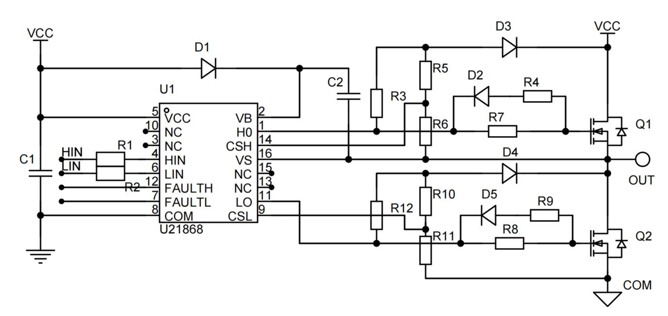 U21868是一款高壓半橋柵極驅(qū)動芯片,設(shè)計(jì)用于高壓、高速功率MOSFET和IGBT。具有獨(dú)立的高側(cè)和低側(cè)參考輸出通道。U21868的邏輯輸入電平兼容低至3.3V的CMOS或LSTTL邏輯輸出電平。內(nèi)部集成了高、低側(cè)欠壓鎖定電路,高、低側(cè)過流保護(hù)電路,輸出具有大電流脈沖能力,輸出電流能力可達(dá)4A。U21868其浮動通道可用于驅(qū)動高壓側(cè)N溝道功率MOSFET和IGBT,浮地通道工作電壓最高可達(dá)600V。