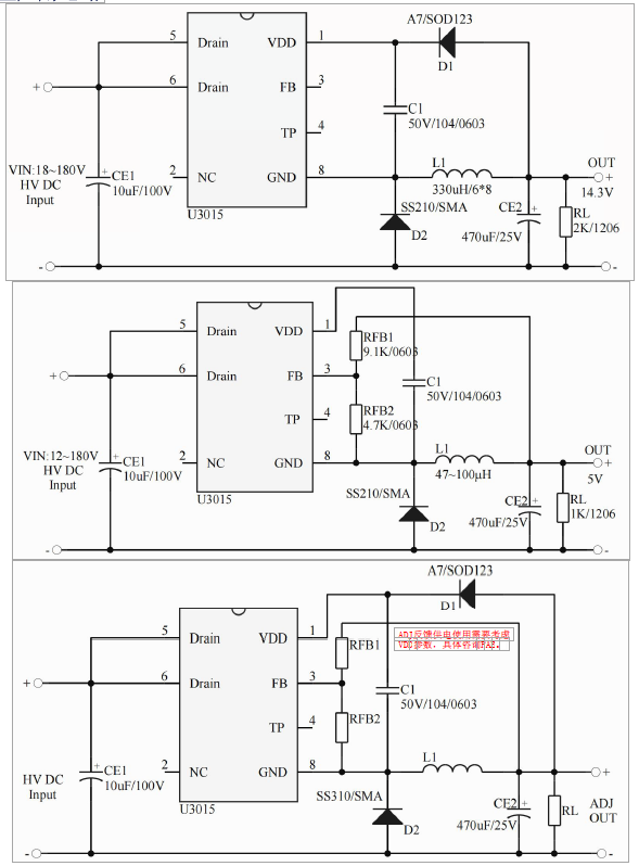 •主要特點(diǎn):WN: 12~180V(OUT:ADJ);集成 2.5A 180V MOS;集成 200V 高壓?jiǎn)?dòng)電路;多模式控制、無(wú)異音工作;支持降壓和升降壓拓?fù)?默認(rèn)14.3V 輸出(FB 腳懸空);待機(jī)功耗低于 50mw;良好的線性調(diào)整率和負(fù)載調(diào)整率;集成軟啟動(dòng)電路;內(nèi)部保護(hù)功能:過(guò)載保護(hù)(OLP);逐周期電流限制(OCP);輸出過(guò)壓保護(hù)(OVP);VDD 過(guò)壓、欠壓和電壓箝位保護(hù)。