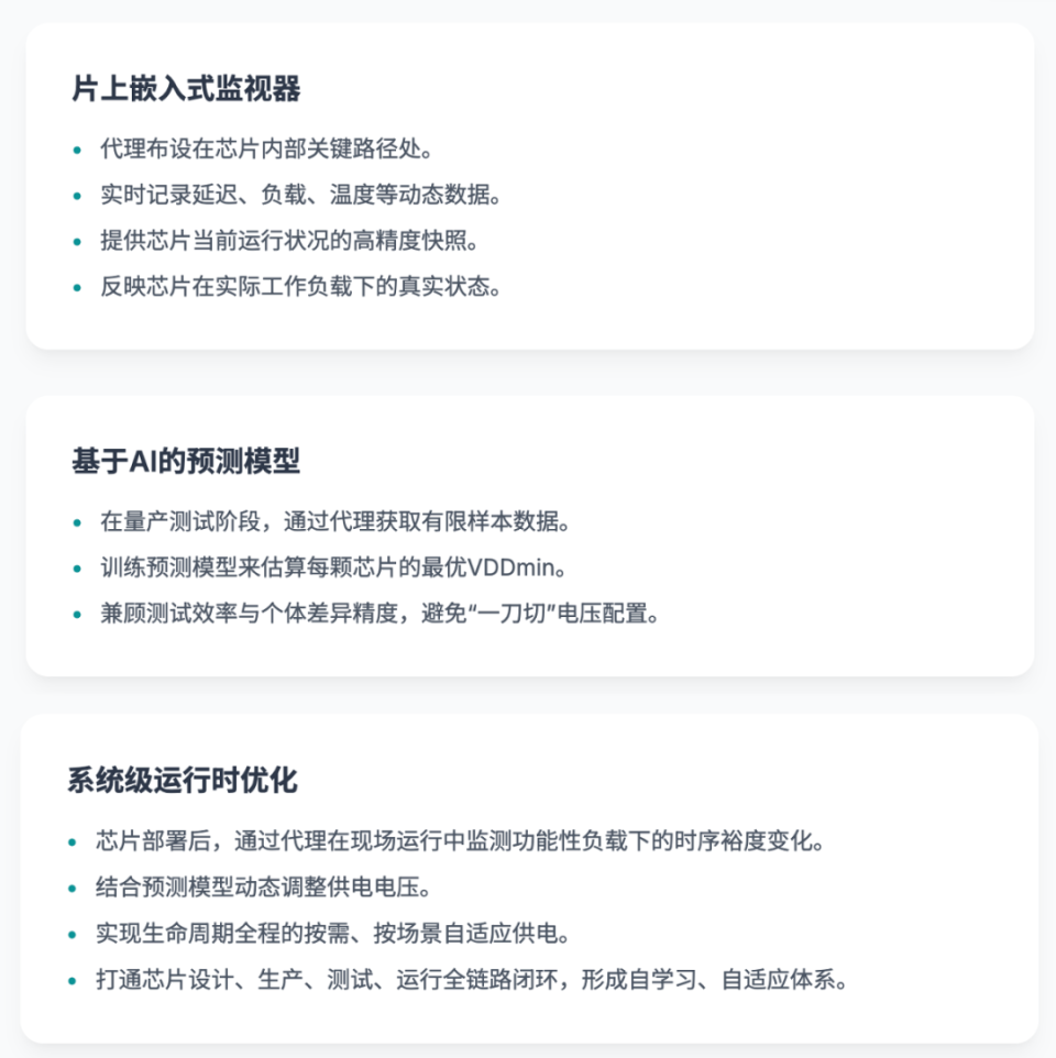 其核心機制在于:通過嵌入式片上代理(embedded agents)對芯片關鍵路徑進行實時監(jiān)測,結(jié)合機器學習模型預測每顆芯片、每一運行環(huán)境下的最優(yōu)VDDmin,從而實現(xiàn)更為精細的動態(tài)供電控制。