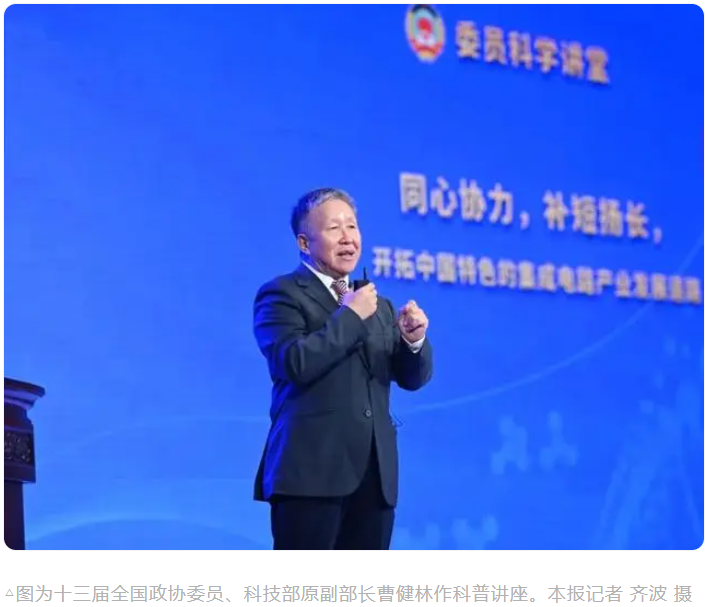 “芯片問題是事關(guān)百年發(fā)展的長期戰(zhàn)略問題,不是短期應(yīng)急問題,必須持之以恒去發(fā)展。”“要充分發(fā)揮制度優(yōu)勢,集中優(yōu)勢隊(duì)伍持續(xù)攻關(guān)。”“要敢于開辟新賽道,打造新生態(tài),推進(jìn)‘再全球化’。”……9月25日下午,寬敞明亮的全國政協(xié)禮堂里,十三屆全國政協(xié)委員、教科衛(wèi)體委員會副主任曹健林正站在舞臺中央巨大的顯示屏前,以“同心協(xié)力,補(bǔ)短揚(yáng)長,開拓中國特色的集成電路產(chǎn)業(yè)發(fā)展道路”為題,為坐在臺下的全國政協(xié)委員、地方政協(xié)委員、高校學(xué)生、科研工作者等700余名觀眾作科普講座。