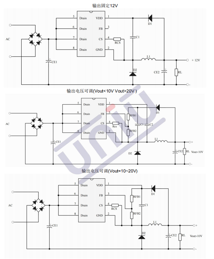 •主要特點:集成 650V 高壓啟動電路;多模式控制、無異音工作;支持降壓和升降壓拓撲;默認 12V 輸出( FB 腳懸空);待機功耗低于 50mW;良好的線性調整率和負載調整率;集成軟啟動電路;內部保護功能 :過載保護 (OLP);逐周期電流限制 (OCP);輸出過壓保護 (OVP);VDD 過壓、欠壓和電壓箝位保護